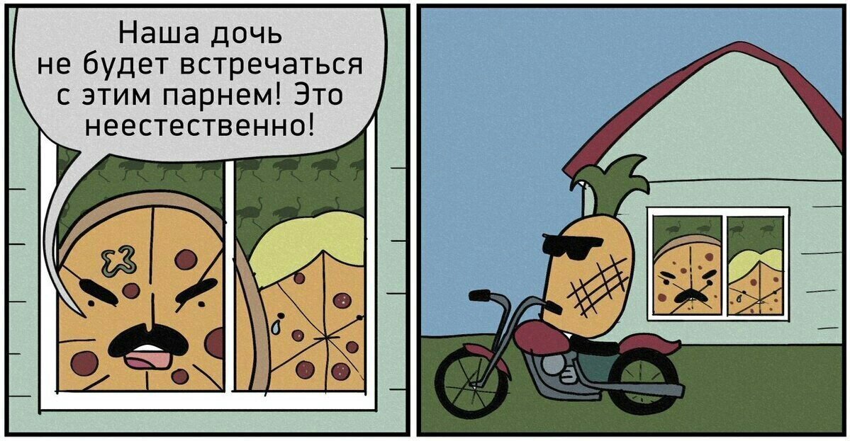 Каждый человек – уникален. И предпочтения в еде у нас тоже разные. Даже не знаю, что бы нам всем одинаково пришлось по вкусу… Ну, разве что «Оливьешка» первого января). Однако, многие люди буквально пугают окружающих своими пристрастиями в еде! Это могут быть настолько несочетаемые ингредиенты, что можно искривиться от ужаса. Об таких блюдах и пойдет речь в сегодняшней статье. Я собрал 7 смешных комиксов про странную еду. Уверен, все эти деликатесы вам хорошо знакомы, поэтому вы без труда узнаете их по описанию. Приятного чтения и отличного настроения! Первое блюдо в нашем сегодняшнем меню хорошо знакомо всем. Подсказка – оно единственное остается нетронутое на вечеринке. И вообще – какой извращенец его заказывает?) Смешной комикс про него, точнее – про нее нарисовал Илья Горюч. Далее следует – классика. Именно с любовью к этому ингредиенту человек понимает, что его детство закончилось. Еще пару лет – и он полюбит и холодец). Догадались, о чем речь? Ответ ищите в комиксе от whats up be