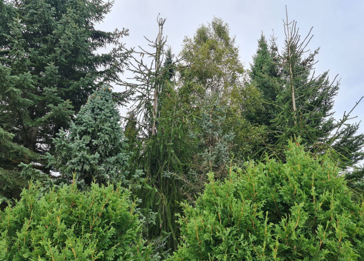 Мой путь к змеевидным елям был довольно труден. Если ель энгельмана Снейк я завела с легкостью, то мой змеевидный первенец Виргата достался мне психологически сложно. Об этом уже рассказывала тут: Но, что уж говорить, при всей своей неоднозначной внешности Виргата производит сильное впечатление. Недавно разбирала картинки последнего своего визита в питомник Сезоны, о котором рассказывала тут и нашла там бесценный материал по Виргате, поскольку это пока единственное известное мне место, где можно наблюдать это растение 20-летним. Итак, подробнее посмотрим на взрослую Виргату. Во-первых, она полноразмерная ель. В 20-летнем возрасте виденные мной экземпляры были высотой метров как минимум 8. При этом своим коллегам из елей колючих и обыкновенных они все же по росту уступают. На фото видно, что Виргата выделяется среди соседей своей лысой макушкой. Именно макушка и есть ее ахиллесова пята, которая и отпугивает от этого странного растения многих любителей хвойных. Тем более что первые 10