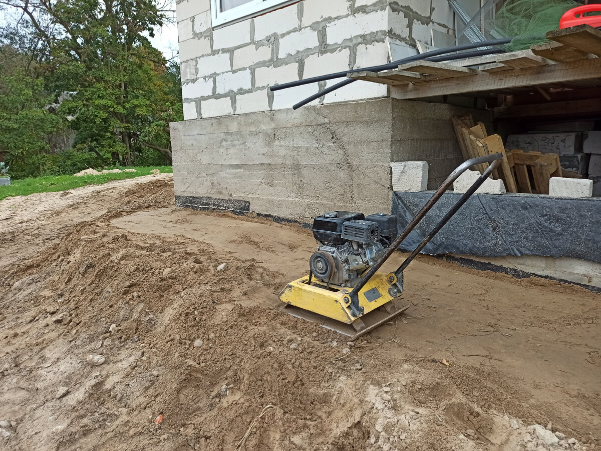 Продолжаем работать с отмосткой нашего дома. В прошлой статье я рассказывала, как мы сделали отсыпку: Конец сентября был очень теплым и мы решили не тратить время и всё-таки утеплить отмостку до зимы. Для этого нужно уложить утеплитель ЭППС и сверху накрыть водотводящей мембраной. Для укладки плит нужен плотный грунт. Мы взяли в прокат вибро-плиту и втроём приступили к работам . Формировали ровную площадку, тут же ее уплотняли, где образовывались ямы - подкидывали песка. По углам пришлось насыпать много вручную. Делать отмостку на склоне - то ещё удовольствие. Сразу стало понятно, что придется довозить ещё грунт, чтобы сформировать ровную площадку не только по периметру дома, но и на 3-4 метра вширь, иначе ходить вокруг дома не удобно, да и отмостка будет размываться. А ниже делать подпорную стенку. Кстати, о размывании. Не успели мы закончить - пошел сильный дождь, уже под ним мы спешно накрывали проделанную работу пленкой со стороны сливов с крыши. В тот же день пришло понимание, чт