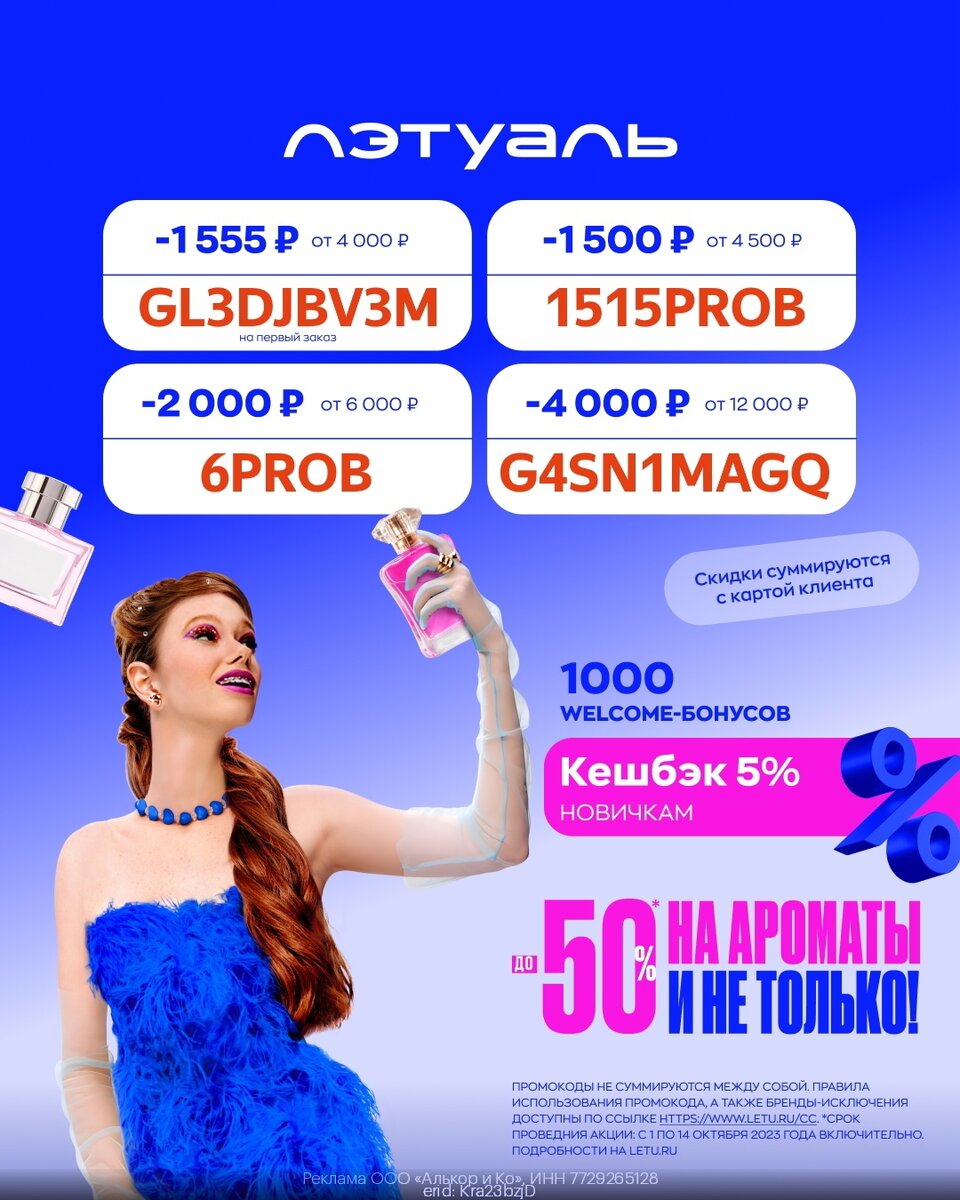 Добро пожаловать на мой канал и доброго времени суток. Сегодня я решила поделиться с вами выгодными промокодами за октябрь 2023 года. Скажу заранее, что все эти промокоды можно найти на просторах интернета, и никаких бонусов я от этого не заработаю, а также не могу гарантировать, что они рабочие. Пожалуйста, проверяйте. Приятного чтения и надеюсь, что данная статья окажется для вас полезной. Конечно, наибольшую выгоду получат новые пользователи, которые ещё ни разу не делали заказы. Но и для постоянных покупателей тоже есть выгодные предложения. Косметика Лэтуаль Довольно часто проходят различные акции и практически всегда есть разные промокоды на скидку, однако нужно внимательно читать условия их действия и подбирать товары, исходя из этого. GLCYBQGWE - скидка до 1555₽ при первой покупке от 4000₽ GT15ZT9APKG - скидка до 1500₽ при покупке от 4500₽ GT20TPAG9YE - скидка до 2000₽ при покупке от 6000₽ G45VSMGPY - скидка до 4000₽ при покупке от 12000₽ Продукты Сбермаркет icczobrg — до ми