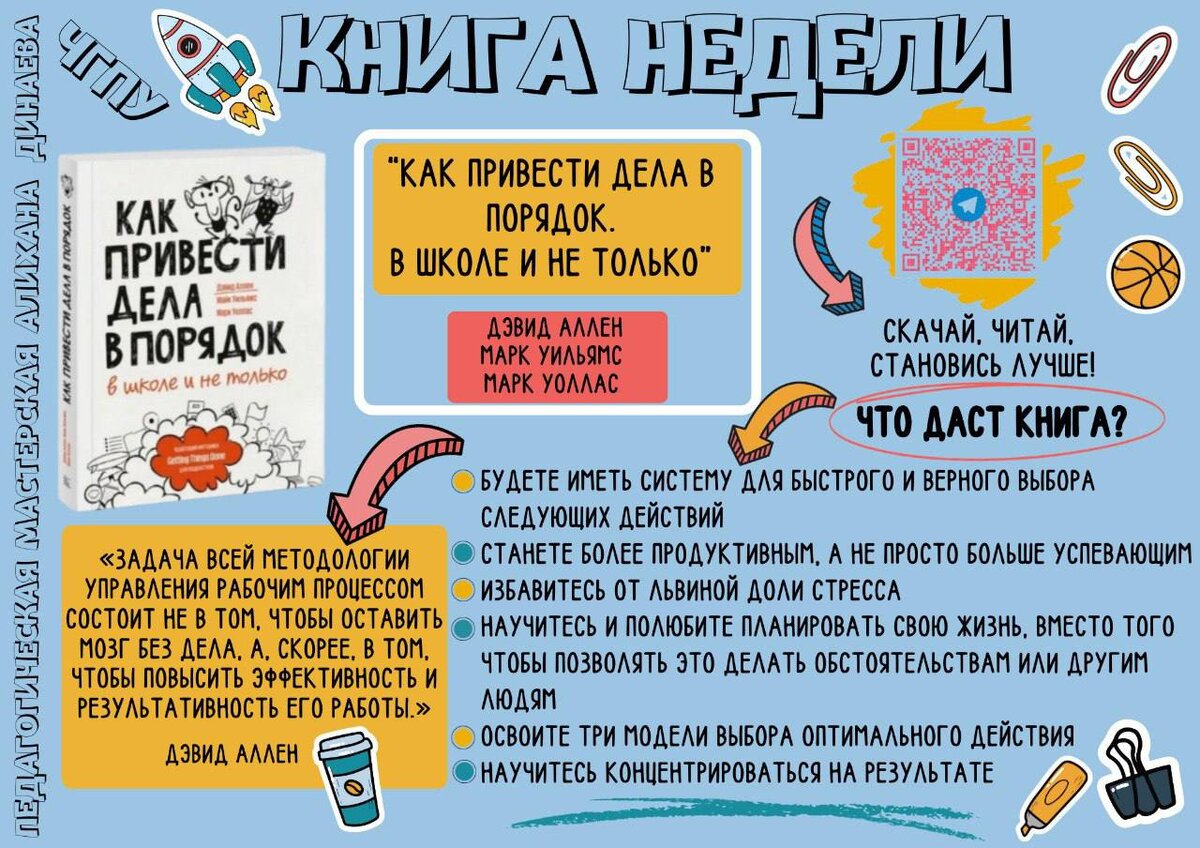 Новая книжная рекомендация от Педагогической мастерской! Хотите грамотно распределять своё время? Повысить свою продуктивность? Получать удовольствие от своевременно выполненной работы? Тогда эта книга обязательна вам нужна! В своей книге «Как привести дела в порядок», ставшей мировым бестселлером, Дэвид Аллен описывает систему организации дел GTD, которая стала рабочим инструментом для миллионов людей по всему миру. GTD ("getting things done'' - в дословном переводе — ''доведение дел до завершения'') — это система тайм-менеджмента, предназначенная для нашего информационного века с постоянными входящими сигналами о том, что следует сделать, обдумать, прочитать, уточнить, узнать, посмотреть… Mетодология GTD занимается вопросами: Скорее скачиваете, читайте и совершайте полезные дела! Ещё больше интересных публикаций и рекомендаций в нашем телеграм-канале!