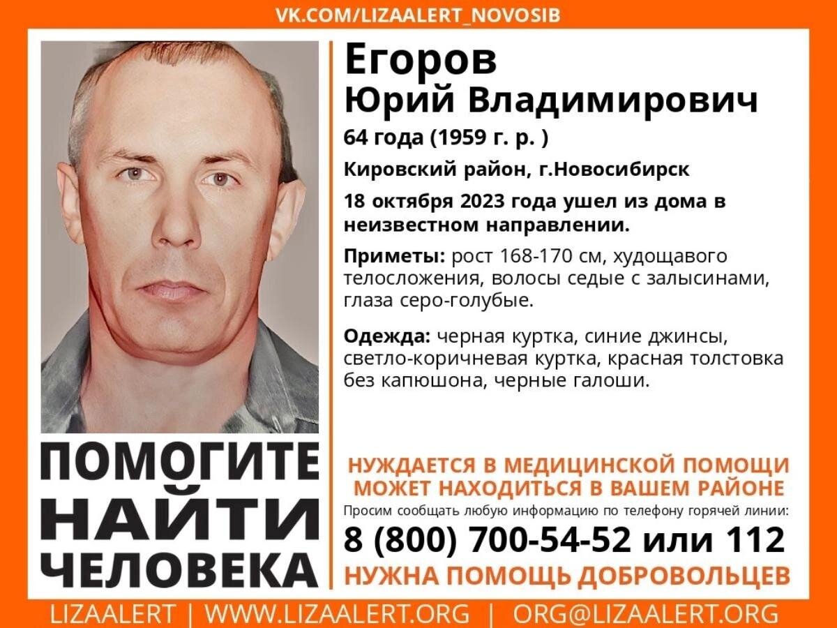 В Кировском районе Новосибирска пропал пожилой мужчина, которому необходима медицинская помощь. В Новосибирске сотрудники полиции и волонтеры поисково-спасательного отряда «ЛизаАлерт» занялись активным поиском 64-летнего Юрия Егорова, который исчез 18 октября в Кировском районе Новосибирска. Он ушел из дома в неизвестном направлении и не вернулся. Ориентировка размещена в сети. «Идет активное распространение ориентировки в сети. Заявка имеет статус “срочно”, потому что мужчина нуждается в медицинской помощи», – прокомментировала Сибкрай.ru руководитель пресс-службы новосибирского отряда Ольга Бобкова. Приметы пропавшего: рост 168-170 сантиметров, худощавое телосложение, седые волосы, серо-голубые глаза. В день исчезновения на Юрии были черная куртка, синие джинсы, светло-коричневая куртка, красная толстовка без капюшона и черные галоши. Если вам что-либо известно о местонахождении Юрия, сообщите по телефону горячей линии «ЛизаАлерт Новосибирская область» 8 (800) 700-54-52 или номеру полиции 112. Напомним, что по дороге из Ростова в Новосибирск пропал 41-летний мужчина.