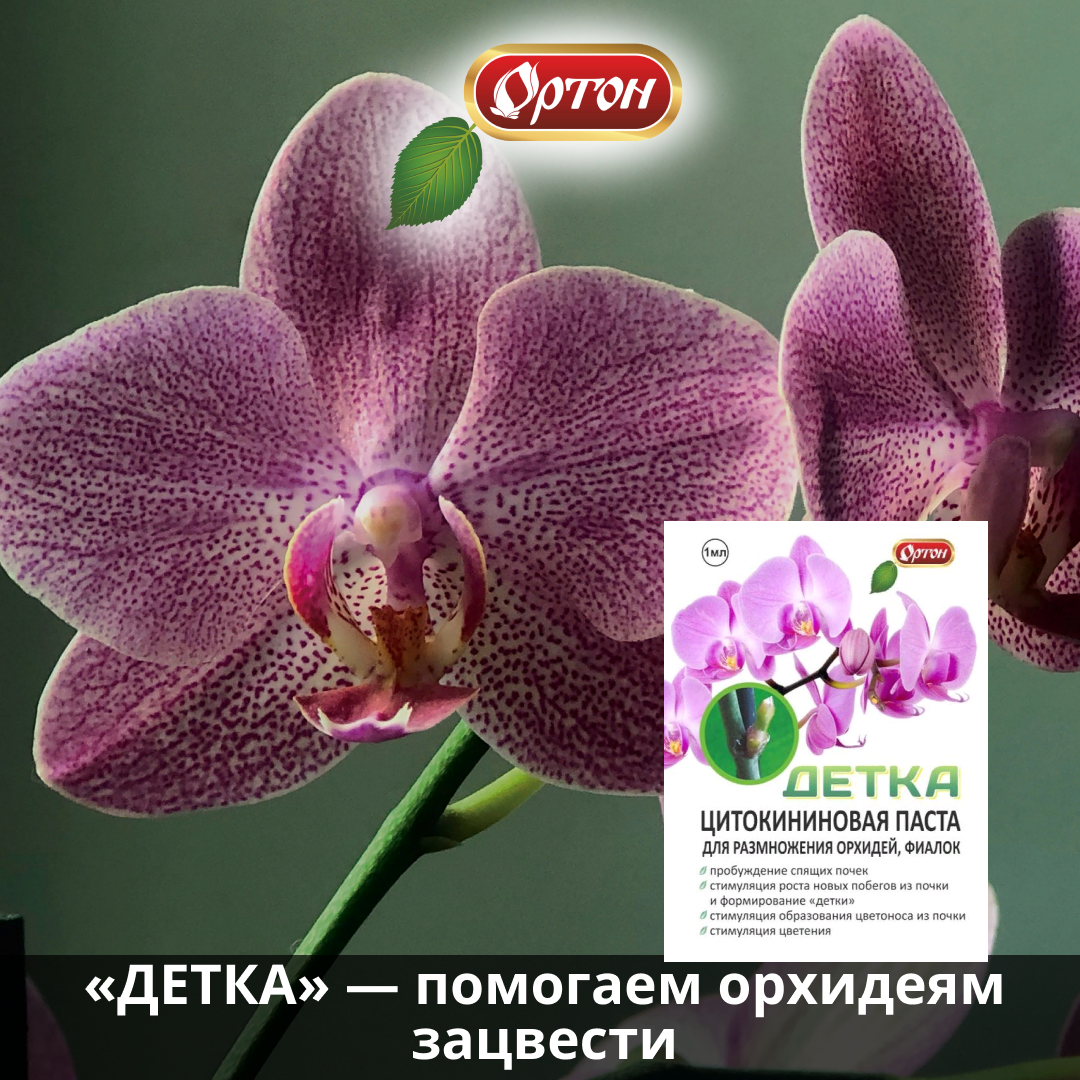Орхидеи — прекрасные экзотические цветы, которые украшают дом. Однако орхидеи очень капризны и могут не цвести в течение нескольких месяцев, а иногда и лет. При этом растение является абсолютно здоровым. Происходит это от того, что владелец старается обеспечить любимцам одинаковые условия в любой сезон: освещение, частота поливов и качество подкормки всегда одинаковы. Но для цветения орхидей требуется смена времен года. Чтобы помочь растениям выпустить цветоносы, постарайтесь изменить уход на пару месяцев: Опытные садоводы знают, как еще быстрее помочь орхидеям зацвести. Цитокининовая паста «ДЕТКА» способствует пробуждению спящих почек и формированию новых побегов. Это уникальный препарат на основе натуральных ингредиентов, который безопасен для людей, животных и растений. «ДЕТКА» — натуральная паста, основным компонентом которой является 6-бензиламинопурин — вещество, идентичное натуральному природному фитогормону цитокинину. Поэтому механизм действия препарата такой же, как и в приро
