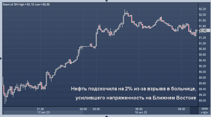 Конфликт между Израилем и ХАМАСОМ углубляется, разжигая протесты на Ближнем Востоке. Иордания отменяет саммит с лидерами США, Египта и Палестины. Запасы сырой нефти в США упали больше, чем ожидалось - данные API. ВВП Китая в третьем квартале вырос на 4,9%, что выше прогноза рынка График нефти марки Brent интервалами в 5 минут Цены на нефть выросли в среду на фоне эскалации напряженности на Ближнем Востоке после того, как сотни человек погибли в результате взрыва в больнице Газы, что вызвало опасения по поводу потенциальных перебоев с поставками нефти из региона. Фьючерсы на нефть марки Brent подорожали на 1,75 доллара, или на 2%, до 91,65 доллара за баррель в 06:09 по Гринвичу. Фьючерсы на нефть марки WTI подорожали на 1,91 доллара, или на 2,2%, до 88,57 доллара за баррель. В ходе предыдущих торгов оба бенчмарка выросли более чем на 2 доллара, достигнув самых высоких уровней за последние две недели. Рынки учли премии за риск после того, как сотни палестинцев были убиты в результате взр