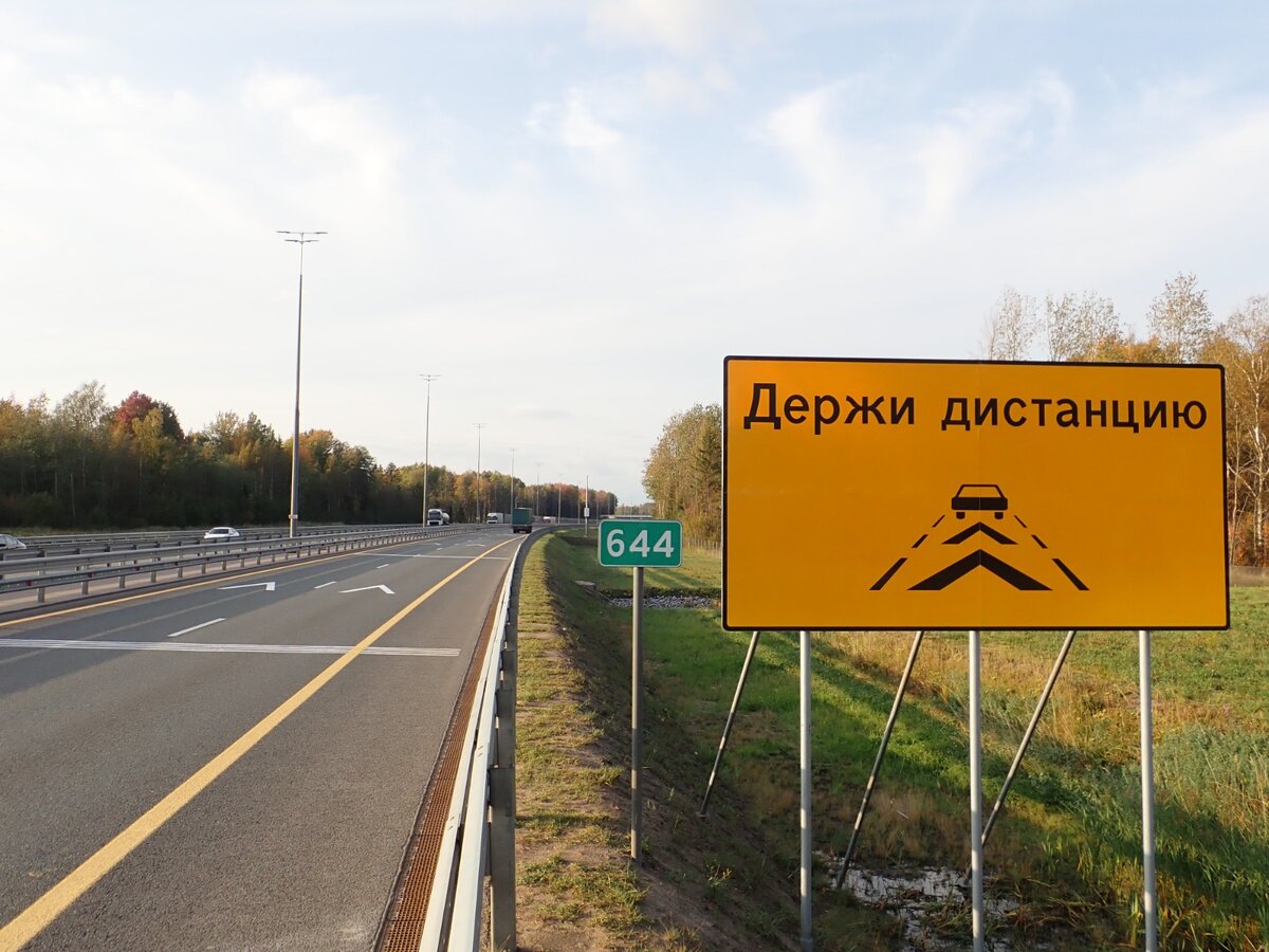 Летом на М-11 появилась разметка в виде шевронов или галочек. Эти незамысловатые знаки помогают рассчитать безопасное расстояние до впереди идущей машины. Безопасная дистанция составляет половину разрешённой скорости. Шевроны нанесены на проезжую часть для того, чтобы водителю было легче соблюсти правильное расстояние. Разметка выполнена в виде ряда галочек. На участке «Магистрали двух столиц» они нанесены в Тосненском районе на 644-646 км дороги. «Ваш автомобиль должен находиться перед первой стрелкой, а впереди идущий за второй стрелкой. Если вы видите перед собой два шеврона, будьте уверены, что держите необходимую дистанцию», – рассказывает руководитель отдела эксплуатации и техобслуживания «Магистрали двух столиц» Богдан Носиченко. Его слова иллюстрируют информационные щиты, которые предупреждают о наличии такой разметки. Галочки носят информативный характер, это прежде всего подсказка для водителей, призыв быть внимательным. Штрафов за нарушение требований разметки не предусмот