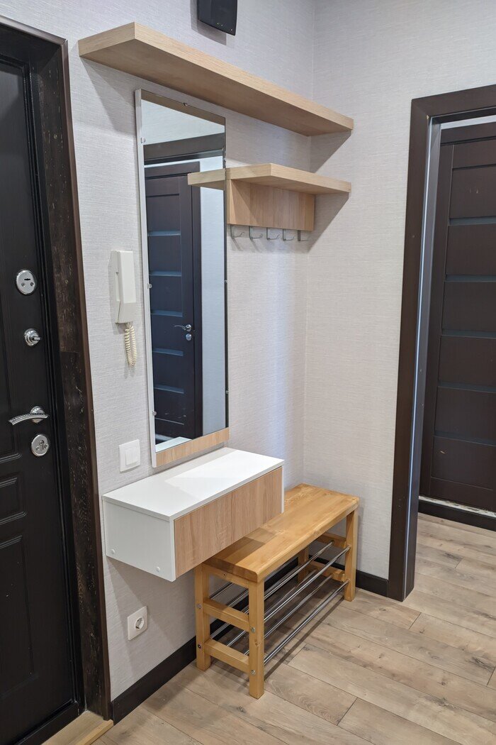 Как это часто бывает к концу ремонта денег не осталось, но было время и материалы. Хотелось что-то простое, из нагугленного понравилась икеевская прихожая Чусиг. Полка и вешалка - остатки столешницы. Крючки из Леруа по 50р, выгнуты и закреплены как у Икеи. Зеркало - старое, было покрашено и замена накладка на кусок кухонного фартука того же цвета. Консоль за тысячу вписалась по цвету и размеру. Обувница тоже по образу Икеи сделана руками без какого-то опыта из 3 метров мебельной трубы, 3 метров бруса 40х40 и мебельного щита/ступени. Бюджет 1.5-2к. Пост автора binba. Больше комментариев на Пикабу.