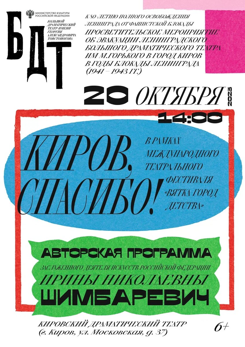 В ходе просветительского мероприятия «КИРОВ, СПАСИБО!» будет рассказано об истории эвакуации Ленинградского Большого драматического театра имени М. Горького (ныне – БДТ им. Г.А. Товстоногова) в Киров в годы Великой Отечественной войны.