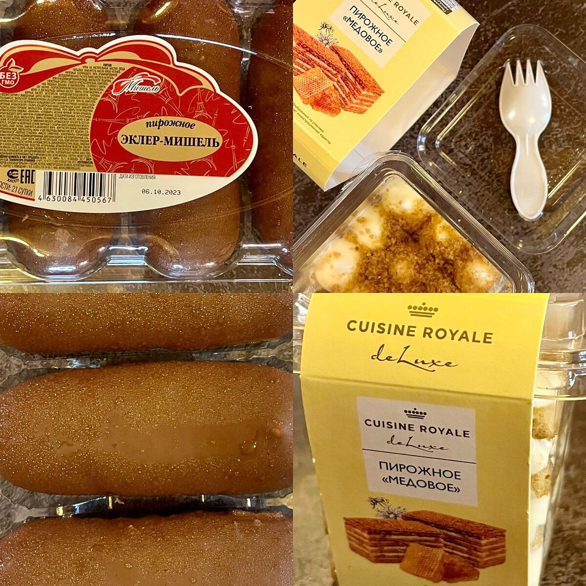 Всем привет, дорогие друзья. Недавно я заметил, что не делал обзора ни на какие десерты и сладости. Было принято решение это срочно исправлять! Ну и конечно, первые испытуемые были куплены во всем известной Пятёрочке. Если интересно - подпишитесь на канал и поставьте лайк. Как говорит известный фудблогер "Десерт - награда за еду". А для меня награда ваша активность и подписка!) Хочу сказать, что я не большой любитель сладкого и удивить меня десертом очень и очень сложно. Но от этого становится только интереснее. Итак, были куплены два варианта десертов - эклеры и медовое пирожное. Рассмотрим каждый отдельно. Эклер Мишель Цена - 149 рублей. В упаковочке 4 эклерчика. Цена вполне оправдана за такое количество, так что придираться не буду. Внешний вид очень приятный и аппетитный. Внутри начинка из заварного крема. Очень нежный и приятный на вкус. Заварной крем внутри и шоколад снаружи очень хорошее и вкусное сочетание, но второй раз я бы покупать не стал. Дело не в том, что это невкусн