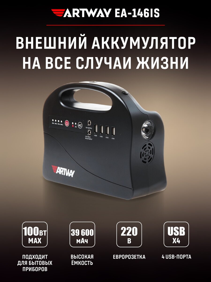 Портативный аккумулятор Artway EA-146IS имеет емкость 39600 мАч, что позволяет заряжать до 10 устройств. Он оснащен четырьмя выходными портами USB, одним портом постоянного тока 12 В и одним портом переменного тока 220 В. Это означает, что вы можете заряжать все свои устройства: от смартфонов и планшетов до ноутбуков и бытовой техники.