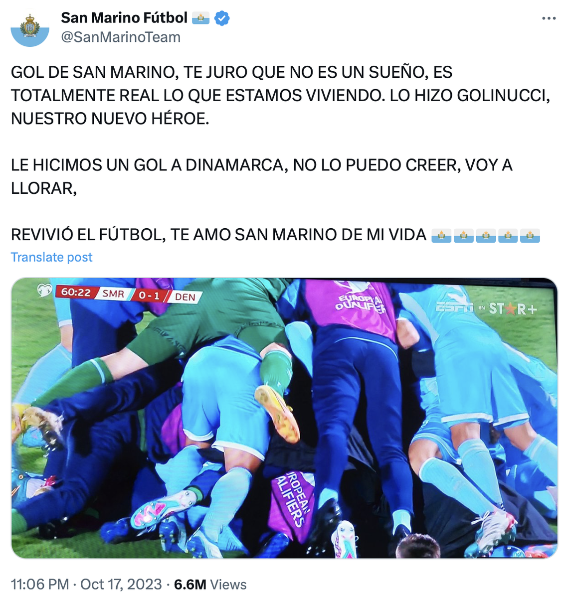 Если вы считаете, что дух футбола уже не тот, то вы точно не фанат сборной Сан-Марино. Серениссима считается одной из слабейших сборных Европы, поэтому положительных результатов от нее никто не ждет. Но текущий отборочный турнир дался жителям карликового государства особенно тяжело. За семь матчей Сан-Марино пропустило 24 мяча, но так ни разу и не забило. От матча с Данией было мало ожиданий. Вплоть до 61-й минуты, на которой человек с говорящей фамилией Голинуччи изменил все. Это был гол. Для понимания масштабов праздника - это реакция официального аккаунта федерации футбола Сан-Марино в соцсетях. 6,6 млн просмотров (население Сан-Марино - 33 тыс. человек). «Гол Сан-Марино, клянусь вам, это не мечта, а то, чем мы живем, это абсолютно реально. Это сделал Голинуччи - наш новый герой. Мы забили гол в матче против Дании, я не могу в это поверить, я буду плакать. Возрождение футбола, Я люблю тебя, Сан-Марино моей жизни». В итоге Сан-Марино проиграло Дании со счетом 1-2.