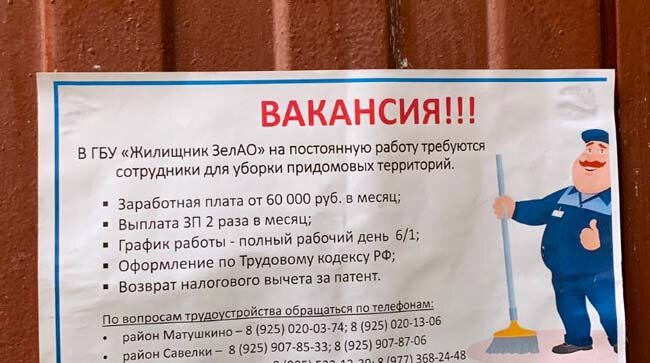 Объявления о вакансиях сотрудников для уборки придомовых территорий появились на подъездах домов. Условия такие: Судя по объявлению, дворники нужны во всех районах. Вот контакты для трудоустройства: С набором дворников для зимней уборки у «Жилищника» проблемы каждый год. В этом году для нормальной уборки нужно 725 человек — это на 73 человека больше, чем нужно было в прошлом году. Штат дворников должен быть укомплектован к 1 ноября ЧИТАЙТЕ ТАКЖЕ