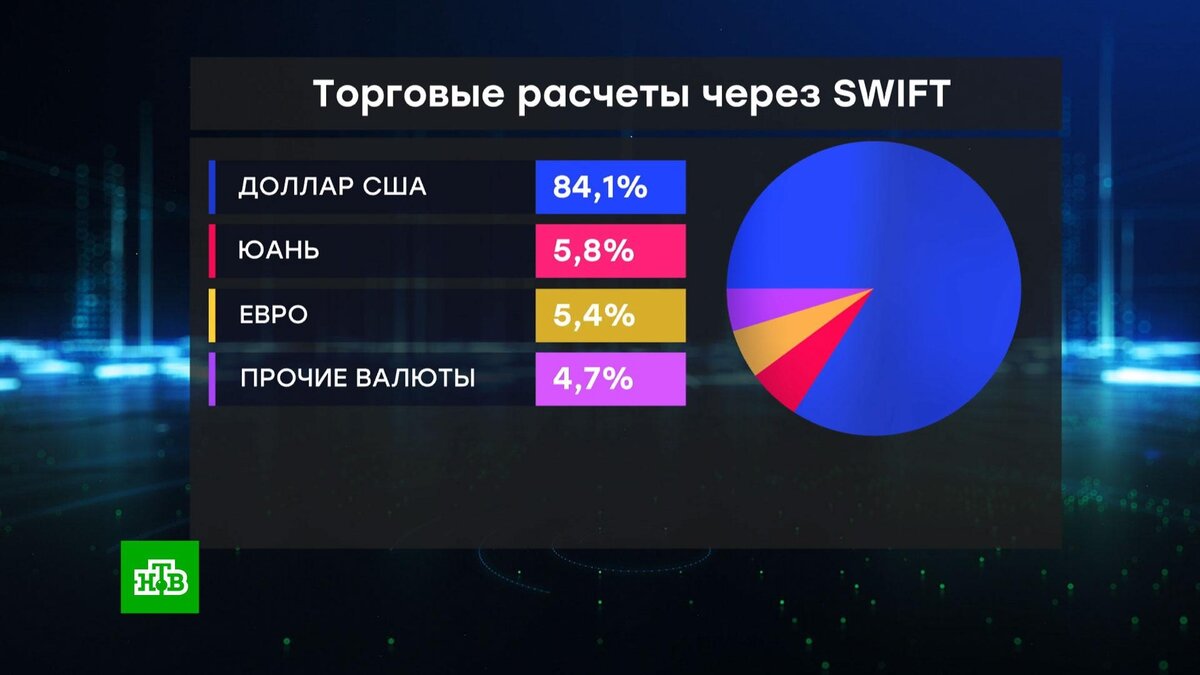 [ Смотреть видео на сайте НТВ ] Юань впервые обогнал евро в торговых расчетах через межбанковскую систему SWIFT, став второй основной валютой в торговле. Доля китайского юаня в торговых расчетах через межбанковскую систему SWIFT в сентябре выросла до максимальных за всю историю 5,8%, что позволило ему обогнать евро и стать второй основной валютой в торговле, следует из анализа РИА Новости данных системы. Главной торговой валютой в сентябре оставался доллар с долей в 84,15%. При этом «американец» с декабря прошлого года стабильно находится ниже 85%, чего не случалось с начала 2018 года. На второе место впервые поднялся юань, доля которого за месяц подскочила сразу на 1 процентный пункт — до 5,8%, что стало абсолютным рекордом для этой валюты. Евро в этом рейтинге упал на одну позицию: его удельный вес в торговых расчетах сократился на 1 процентный пункт — до 5,43%. В топ-5 также входят японская иена (1,4%) и саудовский риал (0,56%). Одновременно доля юаня в международных расчетах в сент