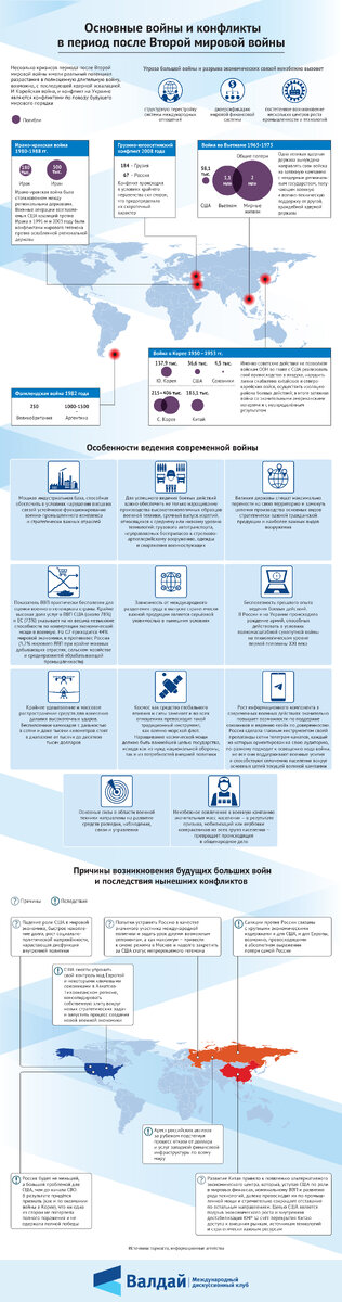 Несколько кризисов периода после Второй мировой войны имели реальный потенциал разрастания в полноценную длительную войну, возможно с ядерной эскалацией. И Корейская война, и конфликт на Украине являются конфликтами по поводу будущего мирового порядка. Инфографика подготовлена специально для доклада Валдайского клуба «Война в новую эпоху: почему возвращаются большие армии». #valdai_infogaphics #война #военныйконфликт