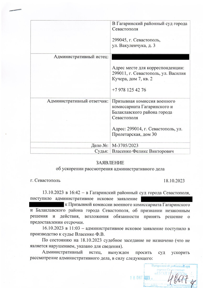 Изготовили заявление об ускорении рассмотрения административного дела, передали в Гагаринский районный суд города Севастополя.