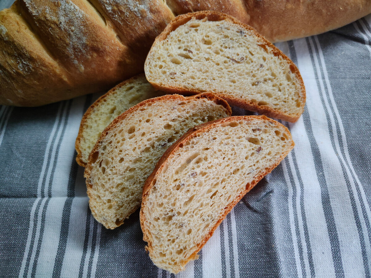 Самый обычный домашний белый хлеб, на каждый день: - вода 280 мл. - соль 1/2 ч.ложки - сахар 1 ч.ложка - дрожжи живые 12 гр. (сухие 4 гр.) - мука пшеничная хлебопекарная 1 сорта 400 гр. + ещё щепотка на формовку - масло растительное рафинированное 1 ч.ложка. - семена льна 1 ч.ложка с горкой (можно без них или заменить на подсолнечные, тыквенные семечки) В чашу вливаем чуть тёплую чистую воду. Добавляем сахар и соль. Размешиваем до полного растворения крупинок: Добавляем дрожжи и также размешиваем: Всыпаем 300 гр. муки из общего количества и вымешиваем лопаткой: Добавляем всю оставшуюся муку (ещё 100 гр.) и семена льна. Вымешиваем тесто. На этом этапе удобно воспользоваться кухонным комбайном с функцией тесто. Но можно вымешивать и вручную 💪 Я вымешиваю примерно 5 минут⏳ Вливаем 1 ч. ложку масла и окончательно вымешиваем тесто ещё 1-2 минуты⏳: Собираем тесто в один ком, округляем. Удобно делать это лопаткой, так как тесто не крутое, немного