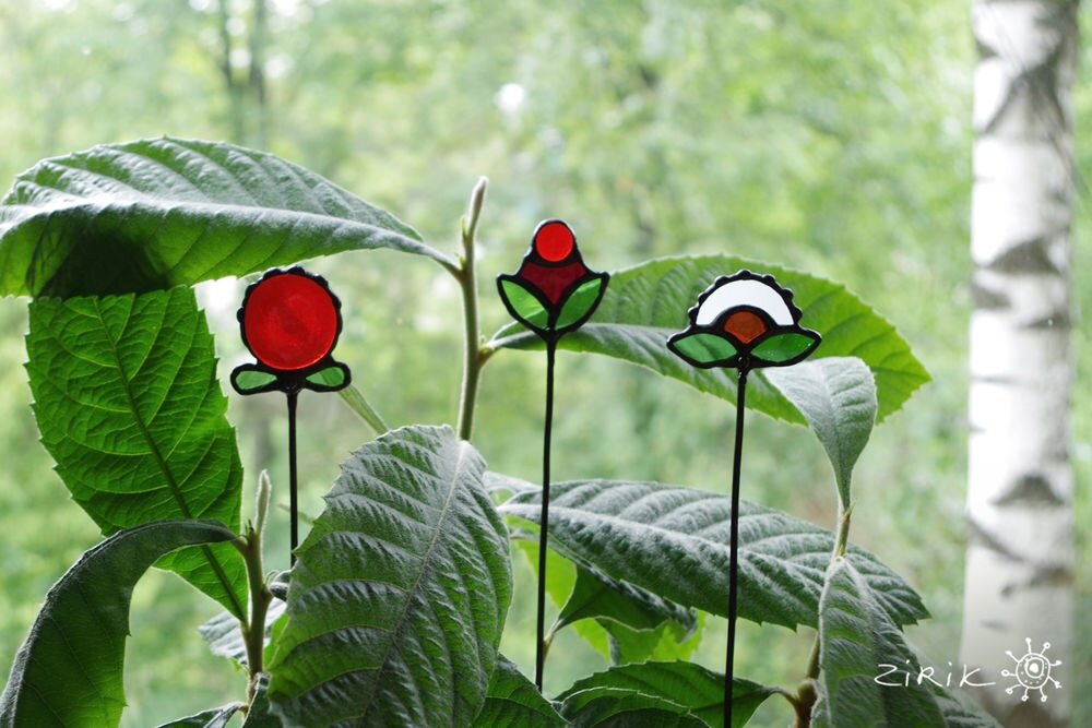 Сегодня я расскажу и покажу как делаю витражный декор Цветочки-ягодки. Это «ленивый витраж», который не требует крепления на окне или стене, его достаточно воткнуть в цветочный горшок. Стёклышки будут играть на свету и солнышке и отбрасывать цветные тени. Такие цветы можно разместить как в доме, так и в саду. Нам понадобятся: 1. Стекло, стеклорез, ломатель и щипцы для стекла, шлифмашина, защитные очки 2. Медная фольга, флюс, припой ПОС 61, паяльник, медная проволока сечением 3 мм 3. Патина, антиоксидант, перчатки. Сначала, как вы могли догадаться, нужно нарисовать эскиз. Далее отрисовываем цветы в размер (мне удобно использовать листы в клеточку), и переводим на кальку. Кальку складываем пополам, чтобы отрисовать одинаково правую и левую часть. Вырезаем шаблон. Затем нужно подобрать стекло и стеклянные камушки, определиться с цветом. Переносим шаблон на стекло при помощи перманентного маркера. Стеклорезом вырезаем детали. Не надо сразу прорезать все линии. Сначала отрезаем крупные кус