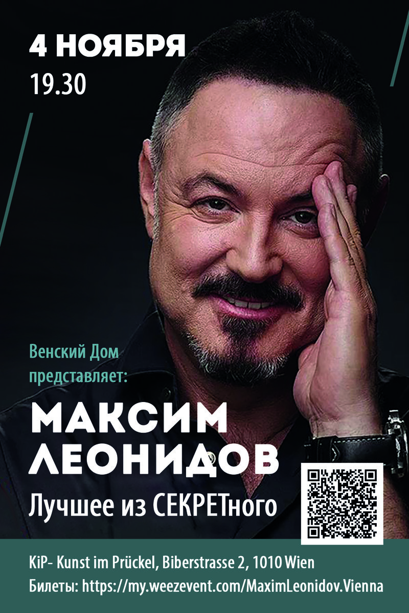 Встреча с Максимом Леонидовым в Вене – отличный шанс посетить творческий вечер любимого исполнителя, чтобы еще раз вспомнить лучшие старые и насладиться новыми песнями в его исполнении. Встречайте осень вместе с фронтменом бит-квартета «Секрет», автором популярных музыкальных композиций и постановок, артистом, завораживающим с первых нот своим уникальным обаянием и слухом. ЧТО ОЖИДАЕТ ЗРИТЕЛЯ Сольная программа Максима Леонидова под наименованием «Лучшее из СЕКРЕТного» представляет собой симбиоз как давно знакомых хитов, так и новых композиций. Зрителям придется совершить завораживающее путешествие от «Привет» и «Девочки-видения» до Mon Amour и других недавно появившихся песен. Билеты на выступление Леонидова в Австрии – это уникальная возможность услышать и пообщаться со своим кумиром: автором и певцом, актером и даже стендапером. Общение с Максимом – всегда неформальное событие, и от этого максимально душевное, наполненное особым уникальным юмором и интересными историями из жизни куми