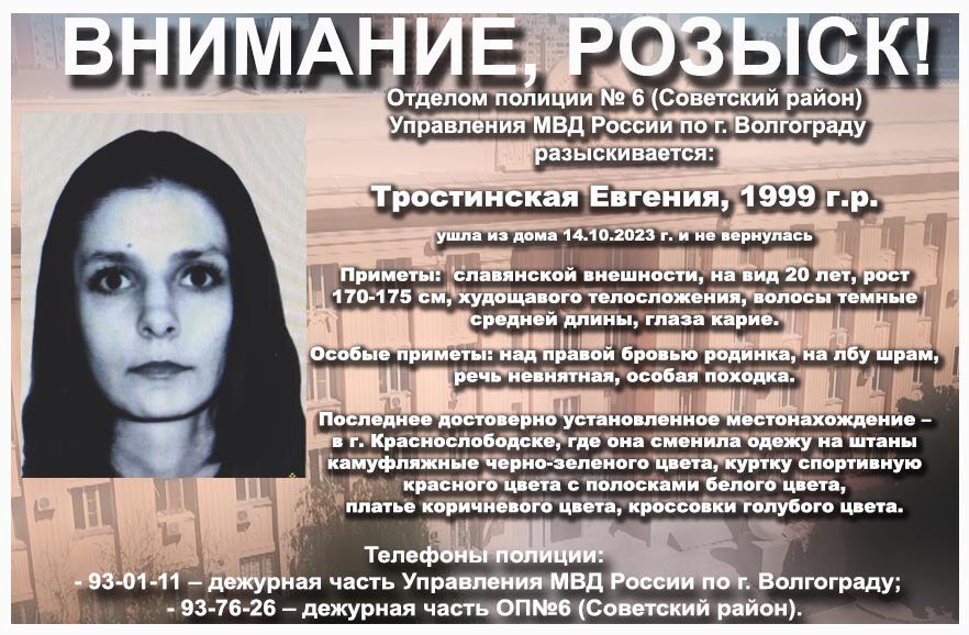 Полиция и родные 24-летней волгоградки просят земляков оказать содействие в ее поисках. Евгения Тростинская может быть в опасности. Сегодня, 18 октября, полиция распространила ориентировку на жительницу Советского района Евгению Тростинскую. Девушка еще 14 октября ушла из дома. С тех пор семья отчаянно пытается ее найти.