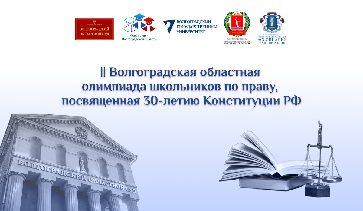 14 октября 2023 г. в Волгоградском государственном университете прошла II Волгоградская областная олимпиада школьников по праву, в которой приняли участие более 250 учащихся средних школ Волгограда, Волжского и нескольких районов Волгоградской области. Соорганизаторами Олимпиады выступили Волгоградский областной суд, Волгоградское региональное отделение Ассоциации юристов России и Комитет образования, науки и молодежной политики Волгоградской области. Участников Олимпиады приветствовали председатель Волгоградского областного суда Алексей Анатольевич Глухов, председатель Совета судей Волгоградской области Александр Владимирович Клочков, а также с приветствием обратился председатель судебной коллегии по гражданским делам Волгоградского областного суда Иван Александрович Гантимуров, и.о. председателя Волгоградского регионального отделения Ассоциации юристов России Олег Александрович Коробов и первый заместитель председателя Комитета образования, науки и молодежной политики Елена