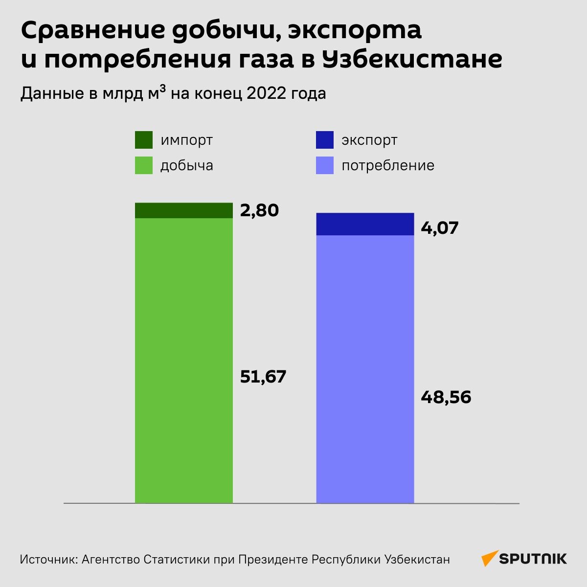 Согласно данным Агентства статистики, добыча газа в Узбекистане на конец 2022 года составила 51,67 млрд кубометров, потребление — 48,56 млрд, экспорт — 4,07 млрд. В ближайшие два года Россия поставит в Узбекистан 2,8 млрд кубометров газа через территорию Казахстана. Напомним, 7 октября Мирзиёев, Путин и Токаев запустили транзит российского газа в Узбекистан через Казахстан. Его будут поставлять в Узбекистан в реверсном режиме по системе газопроводов "Средняя Азия — Центр".