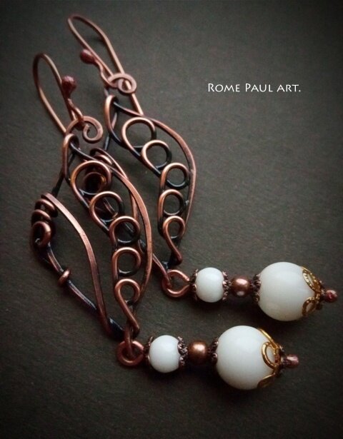 ...Этот камень не похож на другие разновидности кварца. Причем касается это не только внешнего вида минерала, но и его магических свойств и функций. Именно эстетическая и энергетическая уникальность стали причиной высокой популярности белого самоцвета… МАТЕРИАЛЫ: натуральный белый агат-халцедон (Уругвай), кованая патинированная медь (вскрыта ювелирным лаком) Длина серьги: 90 мм ...Одна из легенд гласит, что белый агат миру подарил бог. В битве с силами зла он проиграл. Божество — погибло. Но глаза бога не исчезли. Они превратились в белый агат и распространились по всему миру — чтобы продолжить защищать людей и присматривать за ними. Поэтому маги и литотерапевты всегда относились к такому камню с особым интересом. Миру белый агат открылся задолго до нашей эры. Есть сведения, что его использовали афинские и римские мастера — для создания скульптур и медальонов. Кроме искусства, камень широко использовался в религии, колдовстве. Именно он был символов Помоны — римской богини изобилия, пл