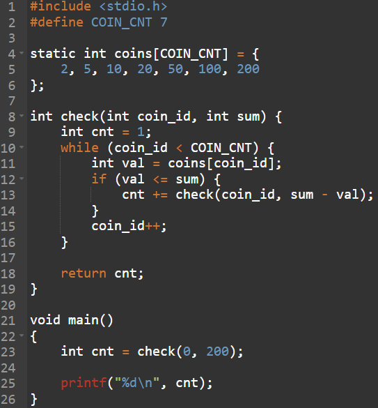 В функцию check() передаётся индекс монеты и оставшаяся сумма. Первоначально это монета с индексом 0 (и с номиналом 2) и сумма 200.
