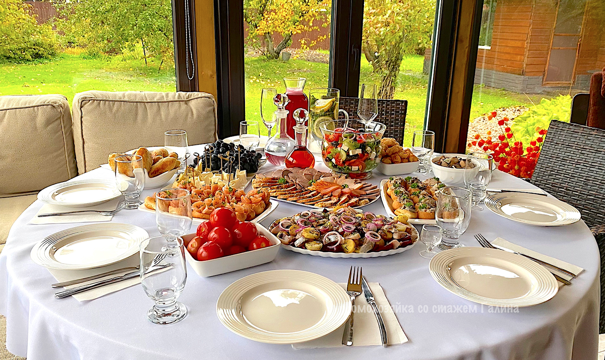 Здравствуйте, дорогие читатели! Праздничный стол был организован по поводу Дня рождения нашей мамочки. Ни разу не было такого, чтобы мама не отмечала свой День рождения. Всегда с радостью накрывает столы и ждет нас, чтобы вдоволь накормить 🤗. Заранее продумывает меню, сама покупает продукты. Без нашей помощи не обходится конечно, мы так же, как и она помогаем накрывать на стол. Блюд должно было быть больше, но посоветовавшись решили вычеркнуть из списка несколько 😄, уж очень много она хотела наготовить. В этот день планировали сделать свиной шашлык на углях, но посмотрев прогноз погоды поняли, что под дождем и в сильный ветер стоять у мангала не очень хорошая затея. Решили запечь буженину и сразу подать на стол со всеми закусками и салатами. Так как вы любите обзоры праздничных столов, я сфотографировала все блюда, которыми угощала нас мамочка. Каждый год вы пишете в комментариях трогательные поздравления для мамы 🤗. Все поздравления она читает и благодарит каждого 🤗. ПРОФИТРОЛИ
