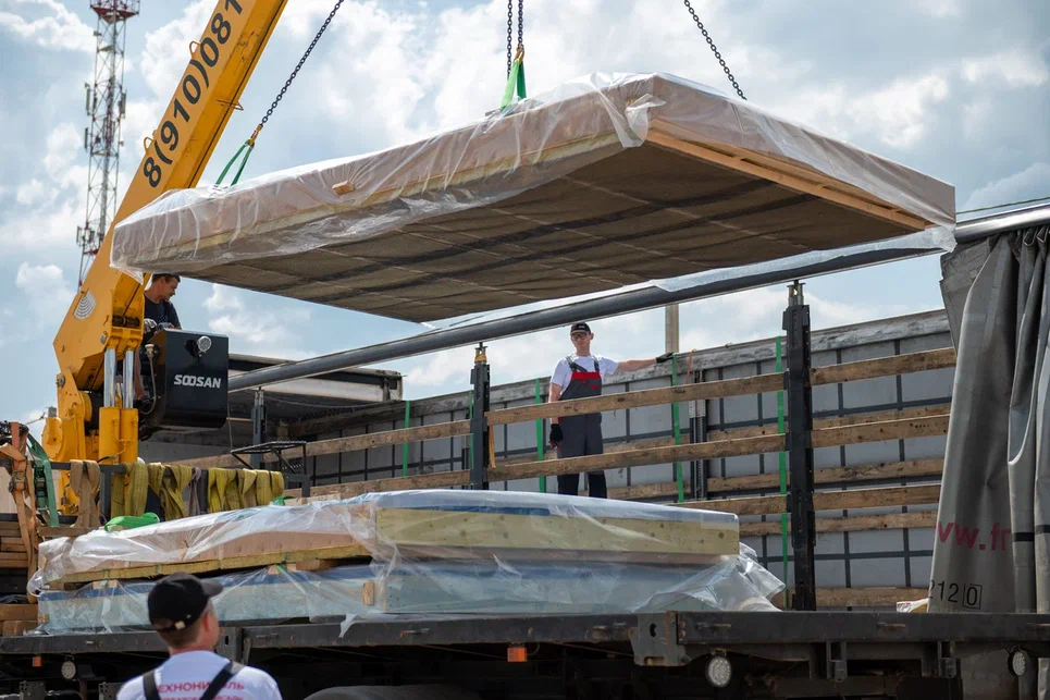 Рассказ о монтаже домокомплекта по проекту ПИКАССО МИНИ, который официальный подрядчик проекта ДОМ ТЕХНОНИКОЛЬ — компания NemtseFF House построила на выставке Open Village летом 2023 года. Часть 2 — про разгрузку и хранение Правила хранения панелей домокомплекта Храните стеновые панели — пирамидой. Панели перекрытий и кровли — горизонтально, на деревянных прокладках. Общие правила разгрузки Первой приехала фура с цокольными панелями, деревянным ростверком, монтажным комплектом. Все упаковано в полиэтиленовую пленку толщиной 150 мкм. Сверху лежит то, что надо монтировать в первую очередь. Монтажный комплект Монтажный комплект — это часть домокомплекта и приходит вместе с панелями. Монтажные стропы На панелях обозначены места, куда надо прикреплять монтажные стропы. Стропы, бруски и саморезы для разгрузки и установки цокольных панелей — тоже в комплекте Надо надеть стропу на брусок и прикрутить к цокольной панели в обозначенных местах Монтажные стропы прикручиваем к панелям в обозначенн