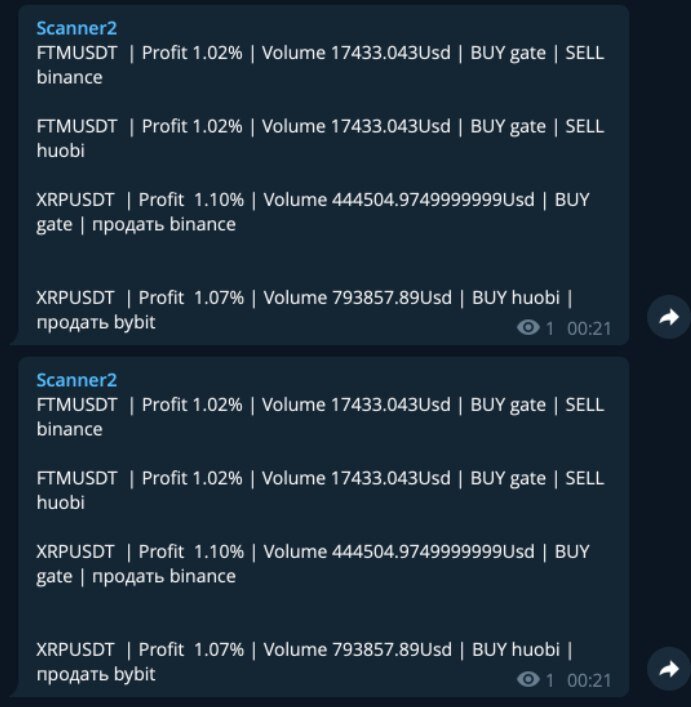 Расскажу вам еще об одном крутом инструменте ArbitrageScanner, который доступен только в тарифе PRO и выше - это Screener. Кстати, благодаря нему я окупил подписку в первые же несколько часов, поэтому рекомендую вам выбирать именно этот тариф. Лучше заплатить больше, чтобы иметь больше инструментов для заработка, которые смогут увеличить ваш депозит в x10 раз уже в первые дни. Ну что, давайте теперь более подробно расскажу про скринер. Как это работает? Скринер показывает все возможные спреды, которые вы настроите по разным биржам и монетам. Этот инструмент идеально сочетается со сканером. Вы настраиваете скринер, находите те биржи и монеты, у которых на данный момент самый большой спред. Переключаетесь в сканер, ставите настройки на эти биржи и монеты, и вам будут показываться самые актуальные спреды. Ниже показываю, в каком формате приходят уведомления: Приведу пример с XRP: как только начался рост, спред был по 15% между крупными биржами Bybit и Binance. Необязательно было держать X