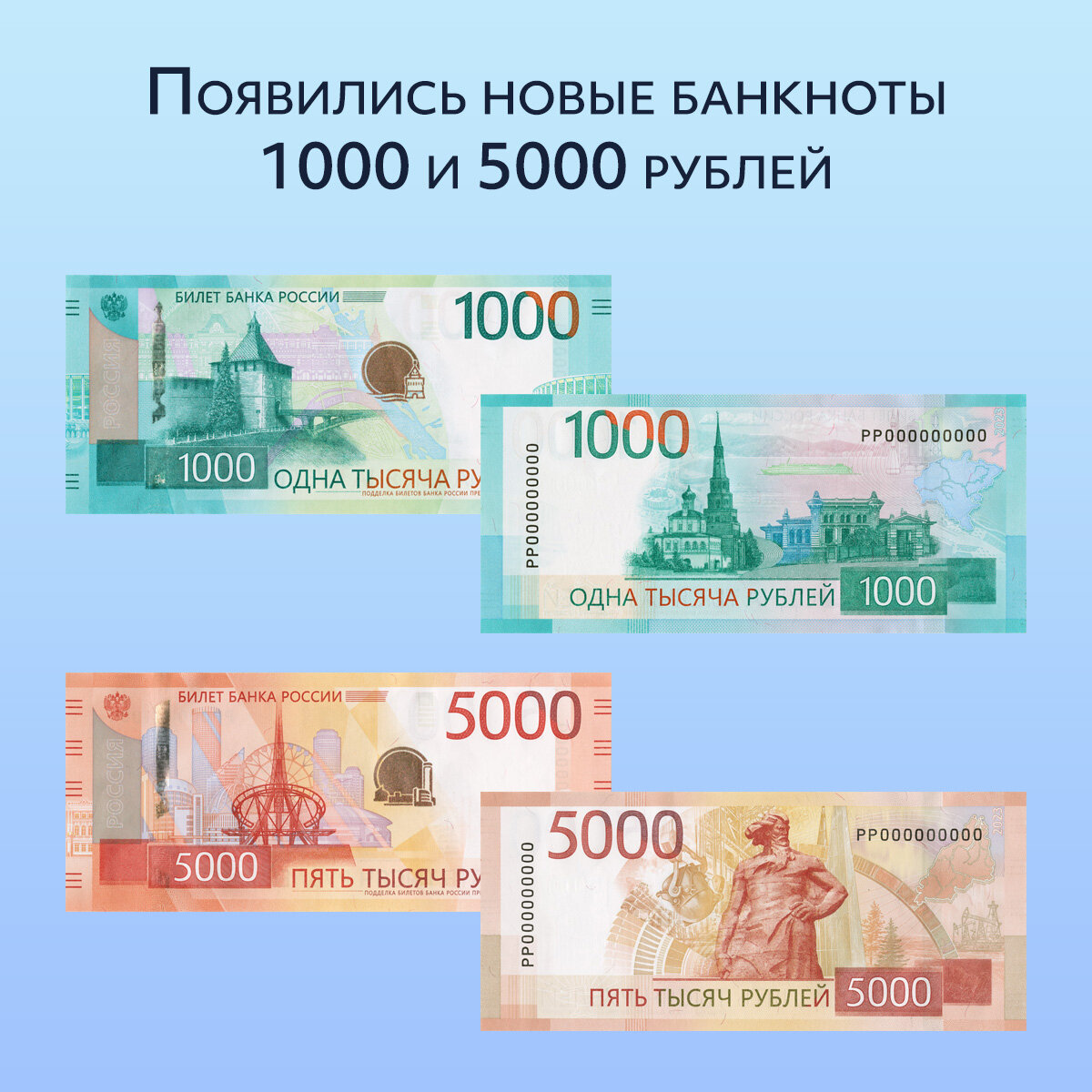 Банк России модернизировал купюры 1000 и 5000 рублей: обновился их дизайн и защитные признаки. Цветовые палитры и размеры остались прежними.