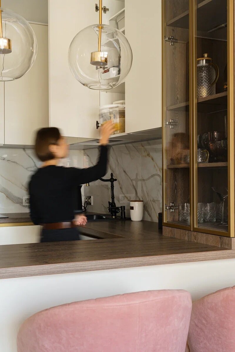 Заказчики кухонь всегда задают много вопросов. Как будут выдвигаться ящики, открываться верхние полки? Иногда заказчики приходят с полностью готовой и продуманной картинкой, остаётся только прорисовать и обсудить детали — и проект готов. Иногда люди просят изначально одно, долго обсуждают, а заказывают в итоге совсем другое. В этом случае заказчица пришла с необычной просьбой: "Хочу, чтобы кухня была как "Вальс цветов!". "Мне очень нравится эта мелодия из балета "Щелкунчик" Чайковского", – объяснила она. "Хочу, чтобы она звучала в голове при взгляде на мою кухню!". Кухня-мелодия. Кухня — всемирно известная прекрасная мелодия! Задача была не из простых... У заказчицы оказался идеальный вкус. Она требовала выверенную по дизайну безупречную композицию, соответствующую великой мелодии. И при этом — никаких цветов как таковых, даже в виде рисунков. Вот это да!!! В итоге центром притяжения кухни-гостиной стал диван глубокого изумрудного цвета. Такой цвет привносит природные, естественные мо