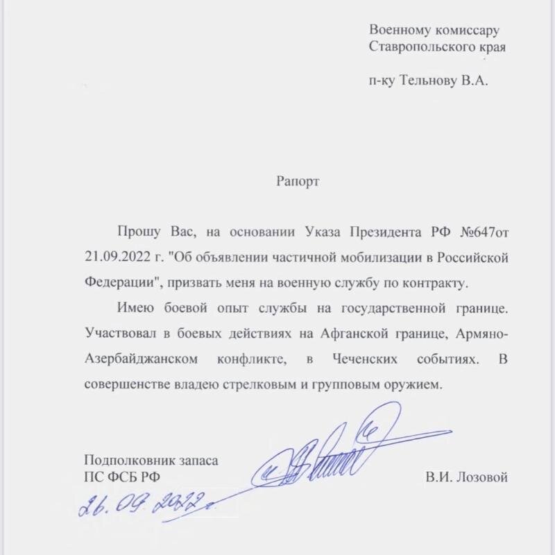 Парламентарий планировал уход с сентября 2022 года. Председатель комитета думы по промышленности, энергетике, строительству и ЖКХ Виктор Лозовой отправился добровольцем в зону СВО. Об этом 16 октября 2023 года сообщила пресс-служба думы Ставропольского края. Народный избранник обращался в военный комиссариат региона мобилизовать его еще в сентябре 2022 года в рамках указа президента России. Депутат является подполковником запаса Пограничной службы ФСБ России. Тогда он считал, что ему хватит навыков для службы в зоне спецоперации и аргументировал свою позицию следующим образом. «Я, как истинный коммунист, считаю своим долгом добровольно подать рапорт о призыве на воинскую службу, встать плечом к плечу с нашими товарищами на защиту рубежей Отчизны. Во все времена компартия, комсомол воспитывали истинных патриотов. И сейчас наши молодые товарищи сражаются не жалея жизней своих за свободу и независимость, как и наши предки борются с коричневой чумой фашизма. Товарищи, наше дело правое» — д
