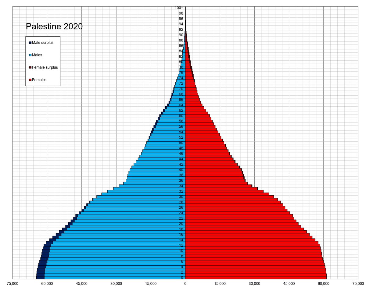 Из за бесконтрольного размножения (бороться за жизнь не нужно, работать не нужно, тебя содержат на всём готовом и лечат благотворительные организации со всего мира) демографическая пирамида в Палестине просто ужасает — только четверть населения — это люди старше 30 лет и население удваивается каждые 30 лет.