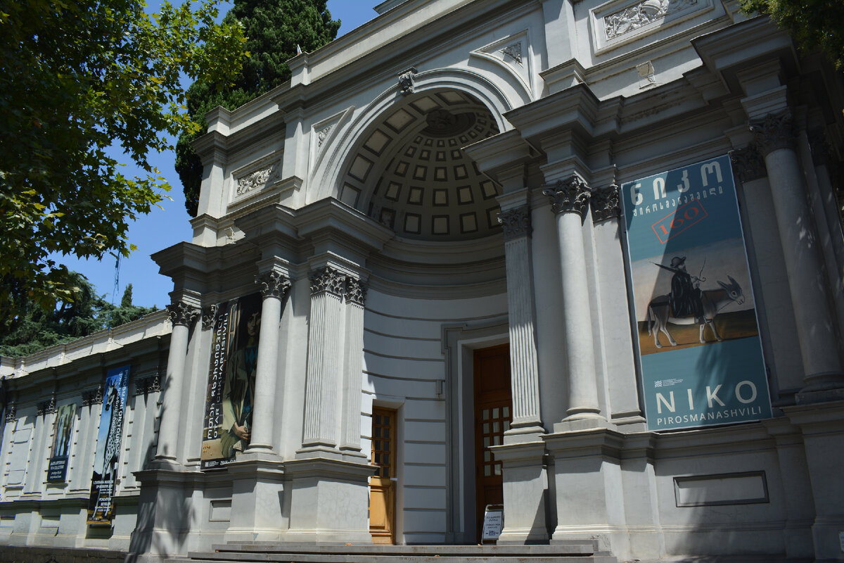 Наверняка вы знаете, что известная песня имела в основе своей почти реальные события. Может быть, вы даже имя того самого художника слышали много раз. Сегодня отправимся на его родину (почти), в солнечный город Тбилиси. Честно признаться, я эту историю до минувшего лета не знала. Просто гуляла по Грузии, просто наткнулась на Национальную галерею, просто зашла... Так она выглядит снаружи (проспект Руставели, 11): Разные скульптуры вокруг: Внутри приветливы и говорят по-английски, объемные вещи предложат сдать в шкафчик. Интерьеры внутри галереи: Билеты стоят не так уж дешево: 25 лари (примерно 900 рублей) взрослый, 10 лари (примерно 360 рублей) школьный. Но нельзя же приехать и никуда не сходить :-) Есть, кстати, при галерее магазинчик сувениров. Тоже не сильно бюджетных, но интересных, тематических. Идём смотреть выставки различных художников. По большей части, местных. Но есть работы и других. Например, российского художника, который долго прожил в Грузии и свой взгляд на неё выра