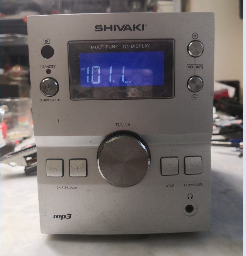 Всем здравствуйте! Сегодня у нас на ремонте музыкальный центр Shivaki ms-131 с диагнозом от клиента - не читает диски. А по факту ещё и еле-еле душа в теле со звуком. Честно говоря особо не верилось что получится исчинить сидюшник, но попытка не пытка. Попробуем. Вот такое чудо :) Радио ловит , но звук еле пищит. Попробовал диск. Поставил , включил. Всё что он нарисовал на дисплее это три полоски :)) Не две :) И что интересно никаких звуков и попытки раскрутить диск не наблюдалось. Попробовал пальцем отодвинуть "лазер" от нулевой точки. Он так и остался стоять на месте. Такое впечатление что драйвер не работает. Нет раскрутки диска и движений головки.