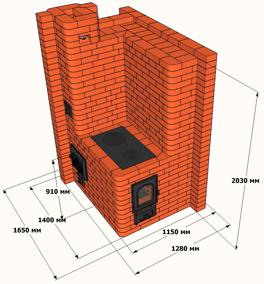 Дровяная (на дровах) отопительно варочная печь «Новгород» из кирпича, с угловым обогревательным щитом, большой чугунной духовкой и варочной плитой, предназначена для отопления индивидуальных жилых помещений дома или дачи, общей площадью до 80 квадратных метров, а также приготовления пищи, и строительство (кладка) этой печи может быть легко выполнена своими руками. Печь может работать с водяным контуром отопления, если встроить теплообменник в предназначенный для этого дымовой канал. Нагрев водяного теплообменника можно отключать при помощи специальной дымовой задвижки, вместе с нижней частью отопительного щита. В печи предусмотрен также прямой («летний») дымоход. Для кладки этой печи требуется 996 штук красного печного кирпича, включая целые и резаные (без учета трубы). В конструкции заложены 3 противопожарные кирпичные разделки, что позволяет безопасно встраивать печь в межкомнатные перегородки для отопления двух или трех помещений одновременно. Например, печь может отапливать кухню-