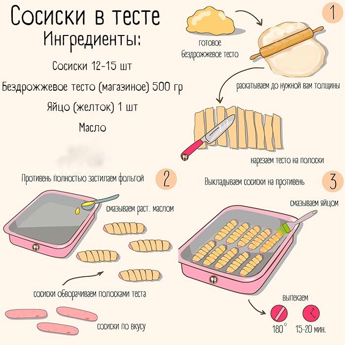 ВКУСНЫЕ СОСИСКИ В ТЕСТЕ ⏰ 30 минут Наверное трудно удивить рецептом "сосиска в тесте", но когда попадается этот рецептик и сразу хочется побаловать себя и близких этими штучками. И не важно, что в холодильнике всего три сосиски остались. Ничего, разрезала- стало 6. Это мой вариант, эконом, ясное дело, что чем вкуснее сама сосиска, тем больше похвалы получишь после Как готовим: Берем тесто и раскатываем до нужной нам толщины, на твое усмотрение. Затем полосками нарезаем тесто, чтобы потом можно было красиво обвернуть ими сосиски. Берем сосисоны и обворачиваем их тестом, кладем на заранее обвернутый фольгой противень(фольгу надо смазывать маслом, чтобы ваши сосиски не подгорали и хорошо отходили), но я не всегда смазываю, куриная память , поэтому обходится и так. Смазываем взбитым яйцом(желтком) сосиски в тесте и отправляем в разогретую духовку до 180С на мин 15-20. Кушайте с удовольствием:)