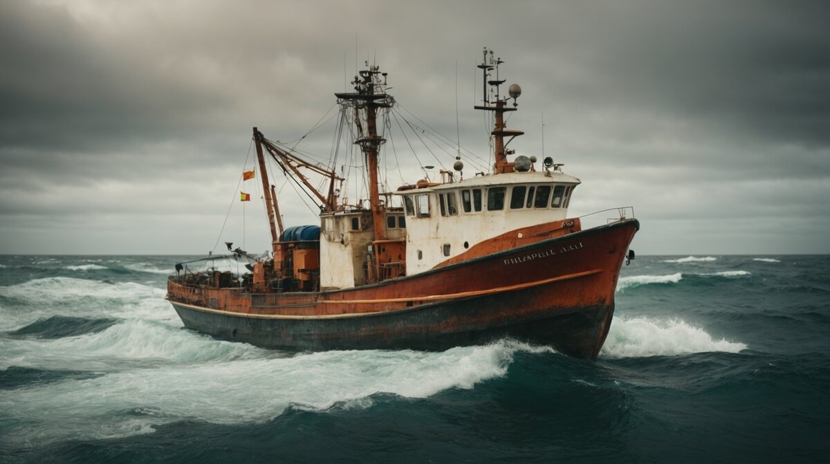 Молодой парень в синем комбинезоне и непромокаемой куртке подскочил к ускользающему по палубе фалу, ухватил его и потянул не себя.