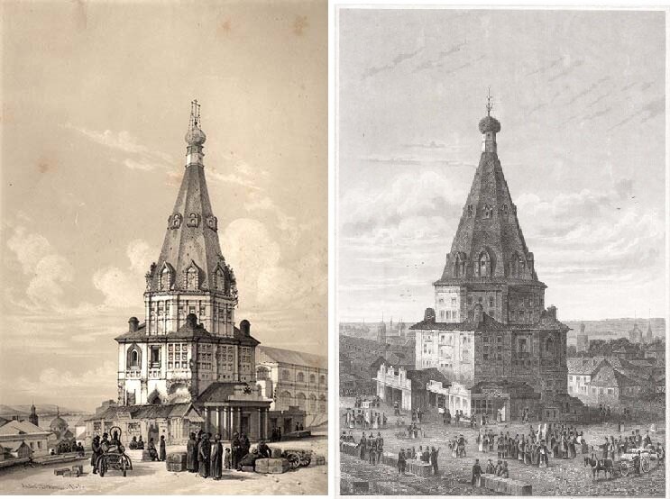 Гостинодворская церковь Николая Чудотворца в Казани. Ох как не любят специально обученные люди эту гравюру (ту что справа). Просто в кровь бьются. А все потому, что она вскрывает ложь историков как нельзя лучше. Обратите внимание на навершие "церкви". До 15 века никаких крестов на церквах не было и в помине. А присутствовал вот этот элемент. Особо упоротые на древнеславии называют его вилочковым крестом. Ну потому что без крестов эти деятели никак прожить не могут в своем унылом сознании. Точно такой же элемент находился в храмовых комплексах Москвы, гравюры также дошли до нашего времени.