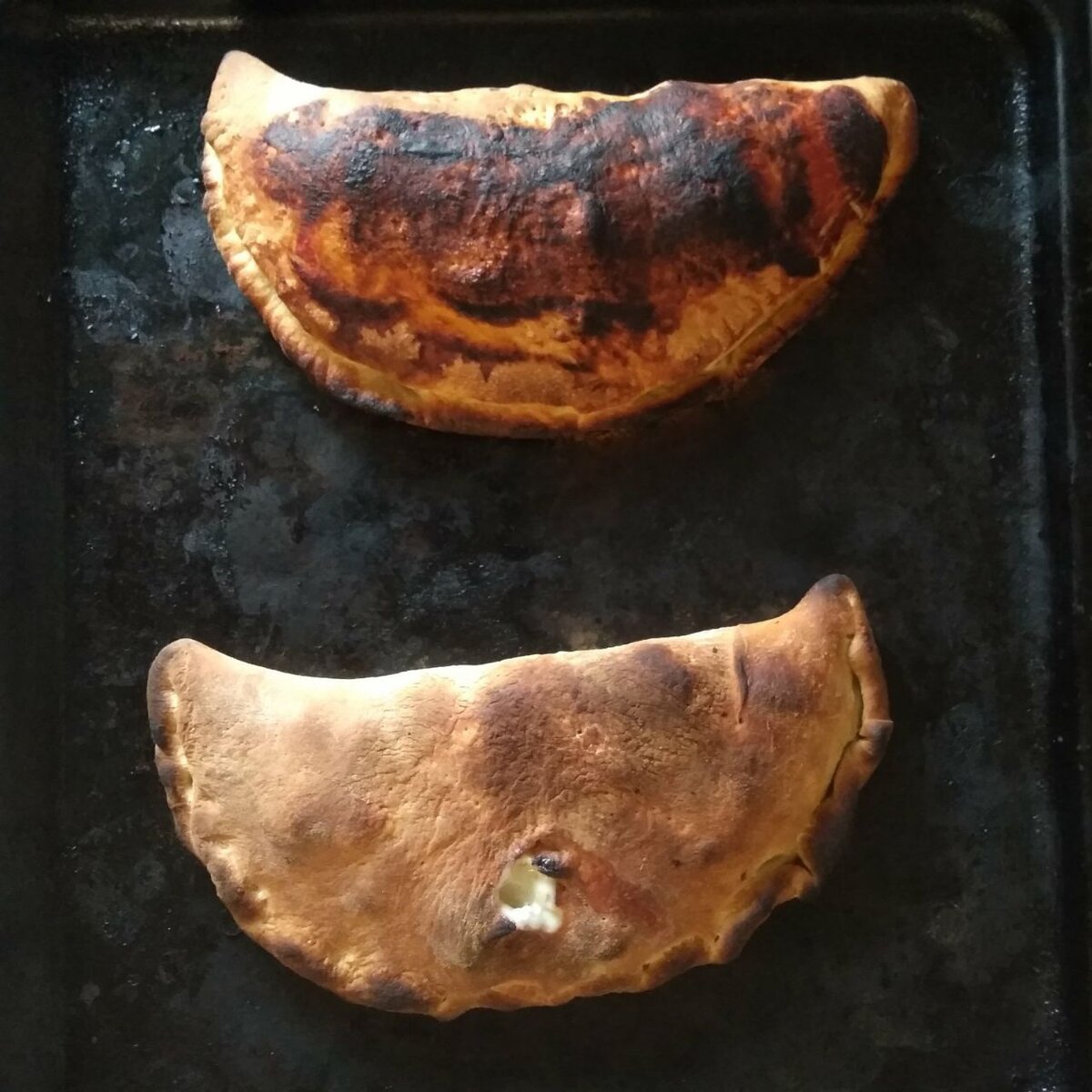 - Далее делаем все быстро, чтобы не промочить пиццы: скалкой раскатываем тесто до размера 25-30 см, выкладываем начинку на половинку и защипываем края. Также по желанию можно сделать разрыв (см. фото) либо надрезы, чтобы тесто сильно не поднялось и не взорвалось в духовке. Сверху по желанию добавляем соус. Также можно смазать пиццы желтком, смешанным с небольшим количеством молока.