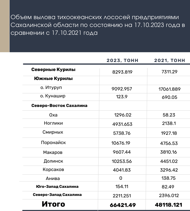 В продолжении нашей рубрики представляем обзор результатов вылова тихоокеанских лососей по оперативным данным предприятий с разбивкой по районам Сахалинской области и по видам рыб. На 17 октября 2023 года вылов тихоокеанских лососей предприятий Сахалинской области составил 66421.49 тн, за неделю добыто 2850.945 тонн. В том числе горбуши 34201.513 тн., кеты 30062.726 тн., нерки 1347.634 тн., кижуча 809.617 тн. По данным, результаты вылова тихоокеанских лососей в Сахалинской области за 2023 год демонстрируют рост в 1.4 раза по сравнению с предыдущим нечетным 2021 годом.