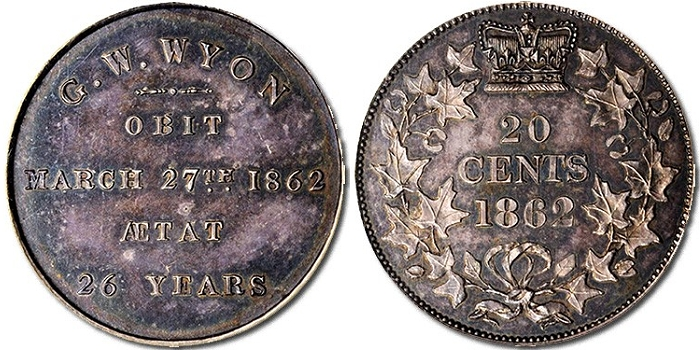 Прекрасным примером этого являлась монета, которая обладая обычным дизайном для нынешних (на тот момент) 20 центов Нью-Брансуика имеет на реверсе невероятно редкий «узор» некролога и довольно трогательный аверс напоминающий о жизни гравера, который скончался в слишком раннем возрасте. Читая «Г. W. WYON / OBIT / 27 МАРТА 1862 ГОДА / ÆTAT / 26 ЛЕТ» в пяти строках эта статья ставит интригующий вопрос: почему выпуск, казалось бы, памятный по своей природе, имеет реверс обычной монеты?