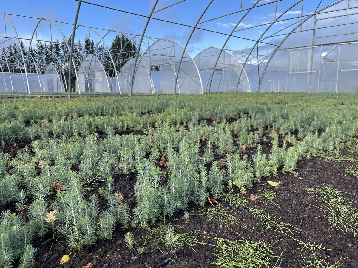 Весной работники питомника посеяли семена ели. Технология защищенного грунта - выращивание сеянцев под пленкой - повысила скорость роста. Первые подсчеты говорят, что 1,5 млн елей достигли своего стандарта — 12 сантиметров - и будут готовы к продаже арендаторам весной следующего года.