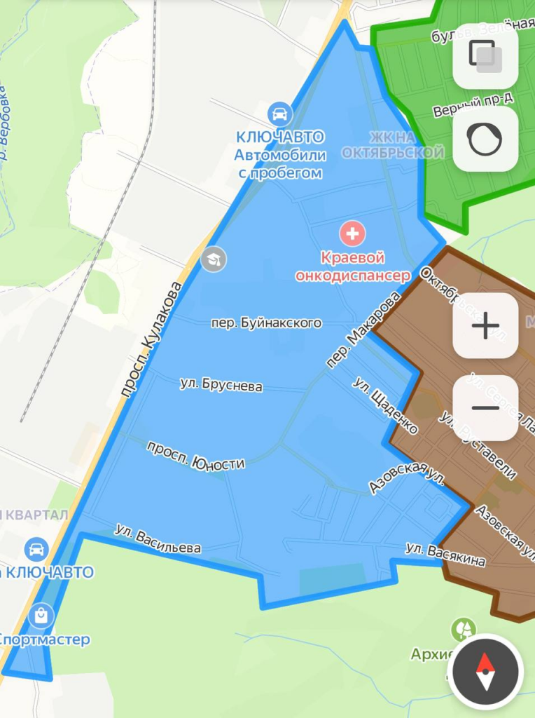 Если взглянуть на карту, то можно увидеть, что на прилегающих к проспекту Кулакова территориях доминируют «многоэтажки-муравейники». Но к востоку картина меняется, и здесь многоквартирные дома уступают место частному сектору. В итоге в пределах одного района можно наблюдать резкий переход от муравейников к небольшим домикам.