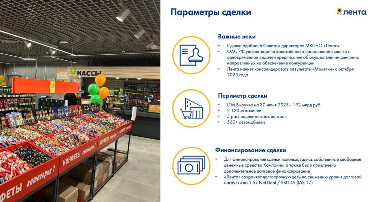 Компания пока не раскрывает сумму сделки, и мы не можем в должной мере оценить повышение долговой нагрузки. Сделаем это чуть позже, но уже сейчас понятно, что позитивный эффект от сделки сможет дать необходимые драйверы роста. Лента начнет консолидировать результаты «Монетки» уже с октября 2023 года, поэтому в 4 квартале я жду крайне позитивный отчет.