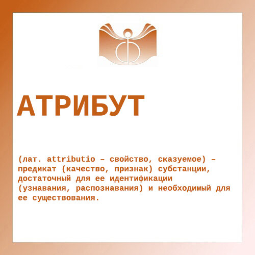 (лат. attributio – свойство, сказуемое) – предикат (качество, признак) субстанции, достаточный для ее идентификации (узнавания, распознавания) и необходимый для ее существования. Говоря иначе, атрибут – это то, что в традиционной логике называют отличительным признаком вещи (differentiae), с той, однако, разницей, что, говоря об атрибутах вещи, подразумевают не видовое, а субстанциальное отличие: «любая разница, созданная какими угодно отличиями, составляет инаковость; но нечто другое получается только в том случае, когда две вещи разделены субстанциальным отличием» (Боэций. «Утешение философией» и другие трактаты. М., 1990, с. 79). Такое различение, конечно, принципиально, если под субстанциями понимать только индивиды (как учил Аристотель, см. Индивидуация). Но оно непринципиально, если мыслить субстанцию как инвариантный аспект любой сущности, в том числе и абстрактной (см. Абстрактный объект), включая роды и виды (как учил Платон). В последнем случае понятие «атрибут» является кл