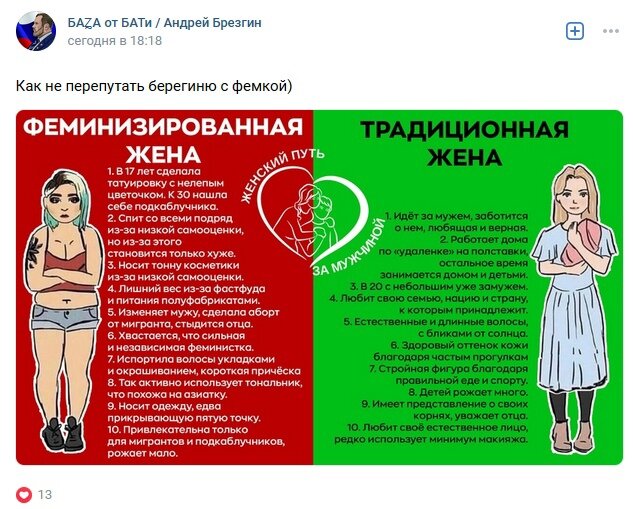 Думаете, раз я феминистка - все так однозначно? Отнюдь. Я вот недавно из 20 пунктов “нормальной женщины” набрала аж 14, суммарно. Очень плохо, я считаю, для феминистки. Вот на днях мне попалась картинка, где “феминизированная” жена противопоставляется “традиционной”. Правда, представители всяких мужских путей и движений никак не могут договориться, феминистки все-таки мужененавистницы или нет. Если да - то как вообще она женой оказалась? А еще часто пишут, что феминистки страшные и на них вообще никто не зарится, даже самый омежистый омежка в мужском мире. А тут они и подкаблучников находят, и мигрантов для утех.