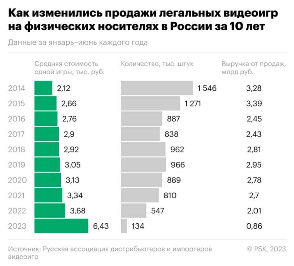 Информационный портал “РБК” пишет, что спрос на легальные видеоигры на физических носителях в России упал в четыре раза. Причины для себя каждый может придумать самостоятельно, но мы ставим на то, что всему виной выросший на 75% (в среднем) ценник на дисковые версии игр. Такими данными поделилась “Русская ассоциация дистрибьюторов и импортеров видеоигр“ (Р.А.Д.И. Видеоигр). Если говорить о деньгах, то падение составило 57% — с выручки в 2 миллиарда рублей до 861 миллиона. Для сравнения — за первые шесть месяцев 2021 года выручка от продаж видеоигр в России составляла 2,7 миллиарда рублей. Еще статистику сильно портят “черные продавцы” — это те благородные ребята, которые завозят игры в страну в обход правил и продают их по более низким ценам, нежели официальные дистрибьюторы. Скажите, а что выбрали бы вы: купить диск с игрой на PS5 на 10 000 рублей, но у “официала”, или за 6000 рублей, но у “черного продавца”?