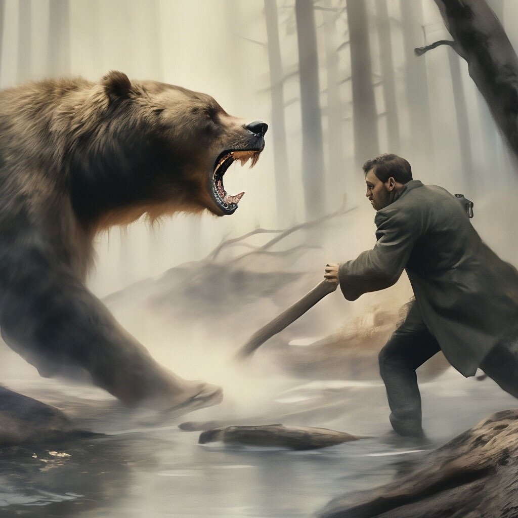 Вообщем дело было так. Продираюсь в лесу сквозь заросли, дебри всякие, и вижу , лежит туша ! Лохматая , здоровая и не шевелится! Я притаился! Смотрю, медведь, собака! Лежит , значит, типа мертвый он! Еще шептунов пускает , чтобы пованивало , сгнил то-есть. Но я то не зверь какой , я что запах гнили от говна не отличу? Обхожу его по кругу тихонько , ступаю мягко , чтобы под ногами не хрустнуло не треснуло. А это я умею, я ж ниндзя в отставке, из клана Ногавнога! Ну так вот , обошел медведя, и дальше по своим делам иду. Час иду, другой. Дорога трудная, тернистая. Вышел к реке, на отмель. Думаю, привал устрою. Место хорошее , вода рядом. И слышу , километрах в трех, ветка хрустнула , потом еще и еще. Я б может и внимания не обратил, мало ли живности разной в округе бродит? Да только ветерок, что вдоль реки бежал, донес до меня зловония, что из недр того медведя исходили! Пердежь по нашему. Тут то я и понял, по следу идет, собака косолапая. Решил заломать меня ,мохнатый! Да только зря он это. Не по Сеньке шапка, как говорится. Долго не думая, соорудил приманку. Развел костерок, разбил палатку, а из палатки сапоги выставил, как будто я внутри лежу. А сам, разделся до гола, измазался илом с берега, и притаился к лесу поближе ,у деревьев. Сижу, значит час, другой, чую, вонища уже нос щекочет, рядом значит мишаня. А хруста от лап его не слышно! Притаился стало быть. Увидел лежку мою и выжидает. Так мы еще час , каждый в своей засаде и просидели. Мне то все равно, я бывало и неделю в засаде сидел, а вот косолапый не выдержал . Смотрю, выходит , и как раз откуда я пришел . И аккуратно так подкрадывается. Подошел к палатке , принюхался , и как схватит пастью сапог и потащил! И тут раз , а в сапоге то нету никого. Миша, в недоумении . По сторонам смотрит, рычит, в палатку полез, нету меня! Носом поводил, вынюхать меня пытался, только куда ему, я ж специально измазался, чтобы не вонять . Минут пять ходил зверюга , и туда и сюда, в итоге, раз и в палатку залез, а сапог на место положил , как и было. Ну , шельма! Это он думает, я приду, полезу в палатку, а он меня там и употребит , завтрак в постель , так сказать. Хитер , собака. Да только я таких на раз два ломаю. Есть у меня настойка специальная, я ее по рецепту древних Русов готовлю . На пол литра водки , ассорти из грибочков секретных замачиваю, и щепотку ягод лесных для вкуса. И настойка эта, звериный дух пробуждает в человеке. Но не в каждом, тут тренировки нужны. Я то лет двадцать эту тему практикую. Тут спешить нельзя. Перебрал, и все , схоронят. Недобрал, будешь ходить слюни пускать, в штаны ссаться. Точная доза нужна. У меня фунфырики от зеленки, по десять грамм. Достал один из поясной сумки, принял. И сижу жду. Тут теперь главное волну поймать . Прошло немного времени и чую, началось . Мышцы силой начали наливаться нечеловеческой! Энергия прям из воздуха в меня входить начала . Зверь во мне силу набирает! Растет! Из горла рык вырвался, не хуже медведя этого, а то и сильнее! Руки шерстью обросли, кости крепче стали. Весь я вырос как будто , и силушки немеряно ! Тут то я из засады и вышел , лапами камни под собой в пыль растираю, от рева моего птицы с неба падают, боком дерево задел, сломалось надвое! Вижу, зашевелился мохнатый, почуял неладное. Морду свою показал, увидел меня преображенного в зверя лютого! А я как с цепи сорвался, крови захотелось , рвать и метать. Я с ревом бегу на 