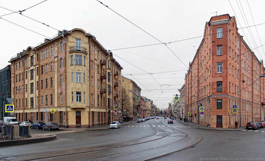 Самый конец Садовой улицы, последние дома на этой улице. Слияние Фонтанки и канала Грибоедова образует острый угол, который к тому же делится Садовой на два ещё более острых угла, задающих форму построенным тут домам-утюгам. Слева - доходный дом Марии Мироновны Греховой
